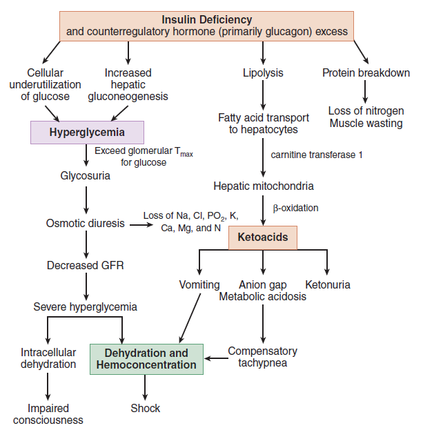 인슐린의 부족과 반대 호르몬의 과다 상태는 고혈당 상태를 유발하게 되고, glucose의 삼투작용으로 과다한 소변배출이 생기고, 이로 인해 우리몸의 체액량이 부족해지는 결과가 초래된다. 체액량이 부족하다는 것은 말 그대로 우리몸의 탈수가 심한 상태로 말라가는 것이다. 그 결과 신기능 저하로 azotemia가 발생, 고혈당으로 케톤대사가 활성화 되며, high anion gap metabolic acidosis가 유발된다. 이는 다시 hyperglycemia(고혈당)을 악화시키고, 악순환의 연결고리가 형성된다.