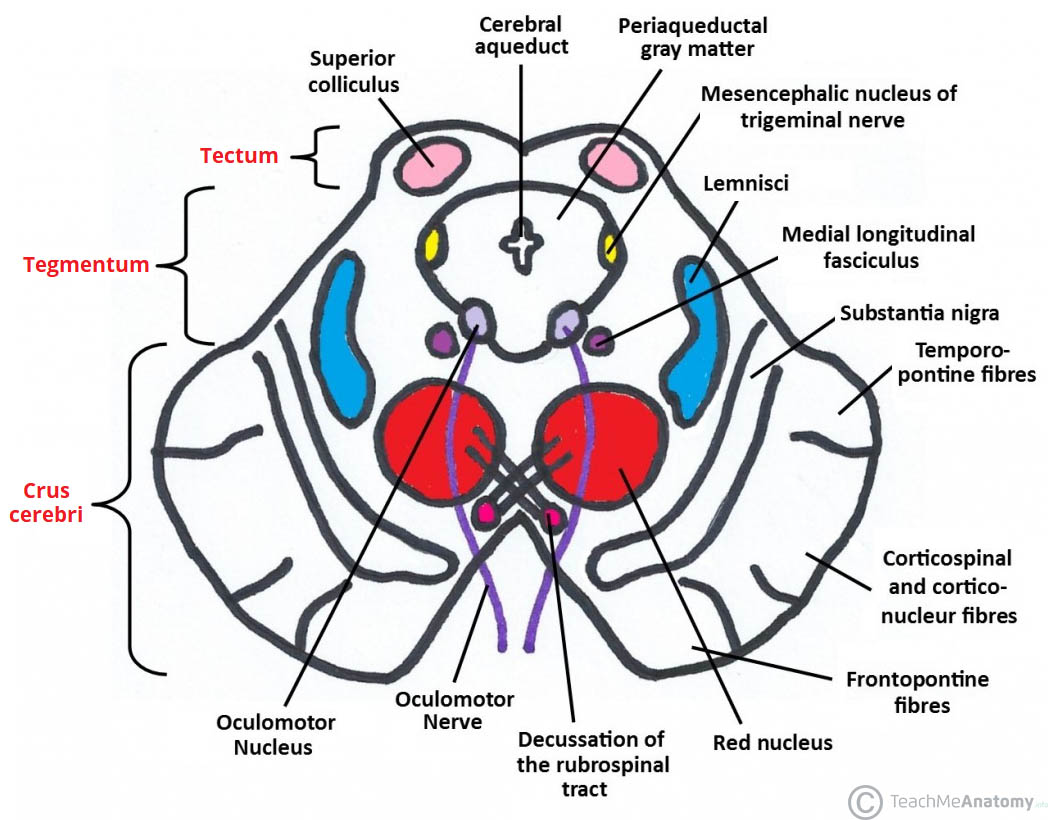 따라서, red nucleus를 기점(intercollicular level)으로 위쪽에 발생하는 병변은 decortication을 일으키고, 아래쪽에 발생하는 병변은 decerebration을 일으키게 된다.