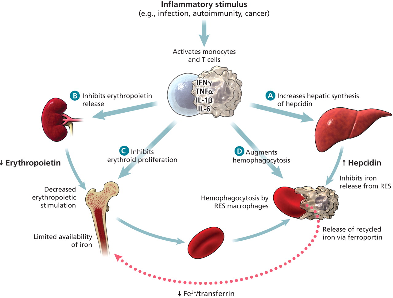- 염증 과정에서 발생하는 다양한 cytokine(사이토카인, IFN gamma, TNF alpha, IL-6 등)에 의해 피가 만들어지는 조혈기능이 떨어지고, 만들어진 적혈구(erythrocyte)의 수명도 감소하여 빈혈이 발생하는 것으로 알려져 있다.
