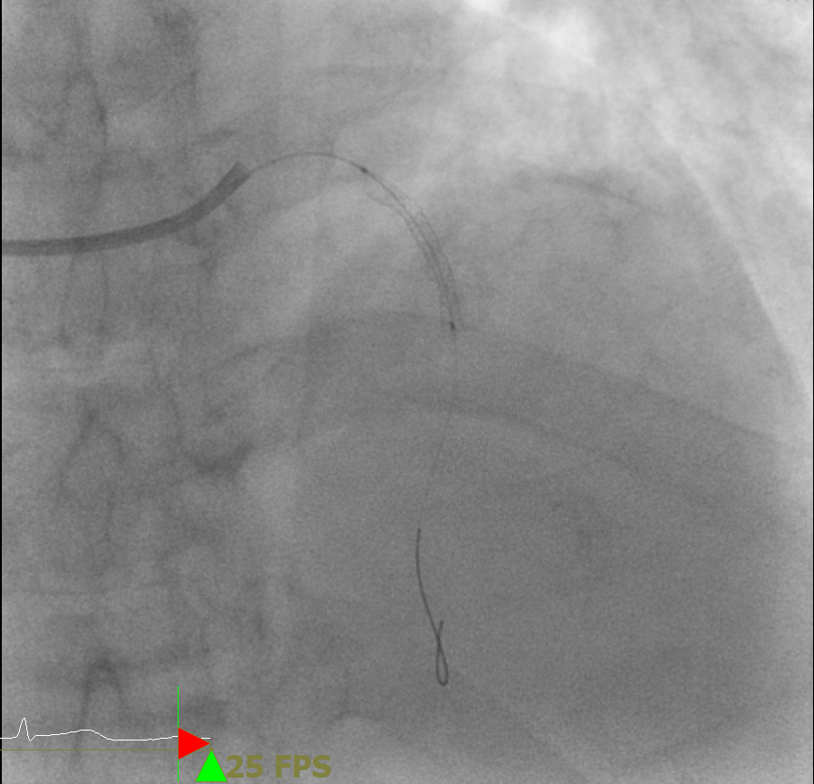 실제 관상동맥 조영술 중 촬영한 영상으로, 가늘고 기다란 카테터를 진입하여 심장의 관상동맥을 확인하고 좁아지거나 막힌 부분을 찾게 된다.
