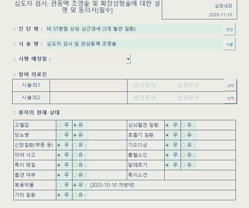 이 환자가 어떤 진단명으로 시술을 받는지, 받는 시술은 어떤 것인지, 언제 시술을 받는지, 누가 시술을 집도하는지를 기입하게 된다.