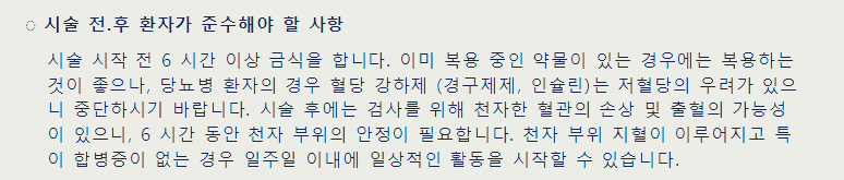 심도자술이나 관상동맥 조영술의 시술 전 준수해야 할 사항으로는 6시간 이상의 금식이 필요하다.