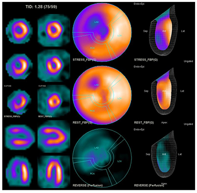 - 민감도 70%, 특이도 80% 정도로 관상동맥조영술과 비교할 때 약 1/3의 환자에서 위양성 혹은 위음성 결과가 나타날 수 있어 해석에 주의를 요한다.