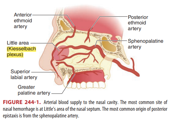 나머지 10% 정도는 코의 뒤쪽에서 발생하는 출혈인데, 위 그림에서 보는 코의 뒤쪽은 주로 internal maxillary artery의 분지인 Sphenopalatine palatine artery에서 발생하는 것이 보통이다. 코의 뒤쪽에서 생기는 출혈은 앞쪽 출혈에 비해 효과적으로 압력을 가할 수 있는 방법이 없어 지혈이 어려운 편이다.