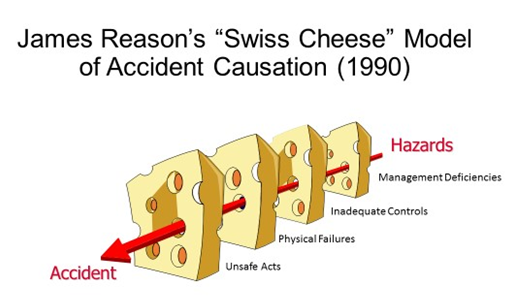 어떠한 오류가 사고로 이어지기 위해서는 여러단계의 헛점(치즈의 구멍)을 통과해야 한다는 이론으로 반대로 말하면 각 단계의 어느 한명만 오류를 인지하고 막아줄 수 있다면 사고를 예방할 수 있다.
