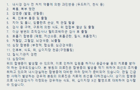 또한 내시경을 하며 출혈 위험은 없는지, 수면내시경시 사용하게 되는 약물에 대한 알레르기는 없는지, 과도한 진정 등의 약물사용과 관련된 문제는 없는지도 확인해야만 한다.