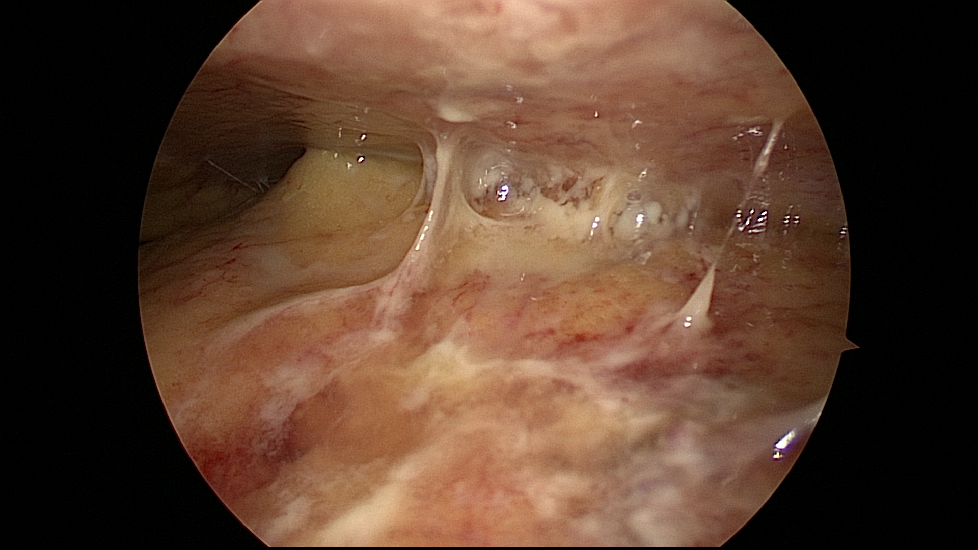 위 사진은 복강경을 통해 본 복막염(복강 내 염증) 소견입니다.