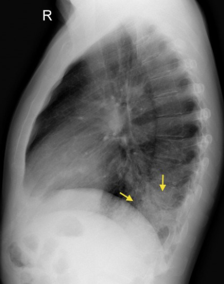 단순 chest PA에서 심장의 contour에 가려 잘 보이지 않은 병변이나, 폐에 생긴 병변의 위치를 3차원 적으로 파악할 수 있도록 도와줘 어느 폐엽에 병변이 생겼는지를 알 수 있도록 해준다. 위 사진에서는 좌측 폐, lower lobar pneumonia를 보여주는 사진이다.