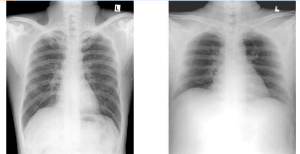좌측의 x ray 사진은 chest PA를 오른쪽은 chest AP로 촬영한 사진이다.