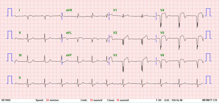 환자가 응급실에 도착 하자마자 촬영한 초기 심전도 사진이다.