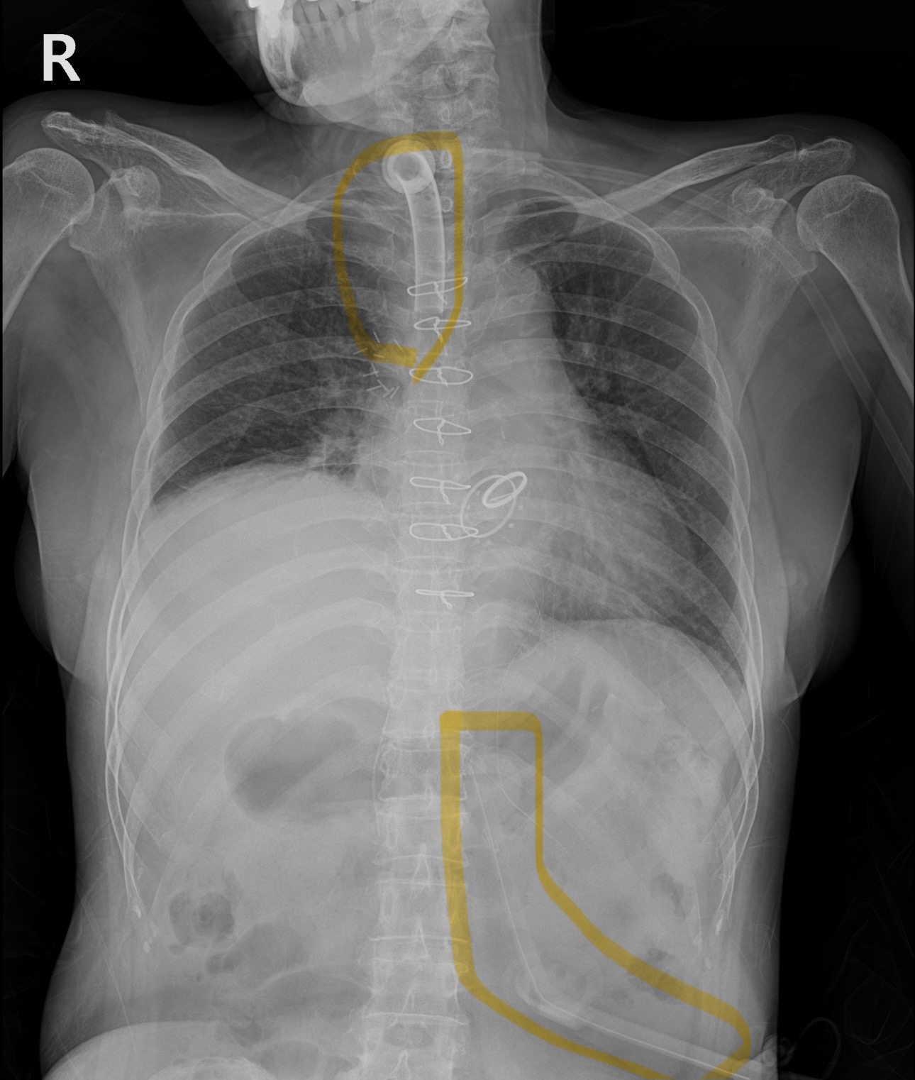 위쪽 노란색 표시가 기관절개후 유지하는 tracheal tube, 아래 복부쪽 노란색 표시가 PEG tube(경피적 위루술 튜브)