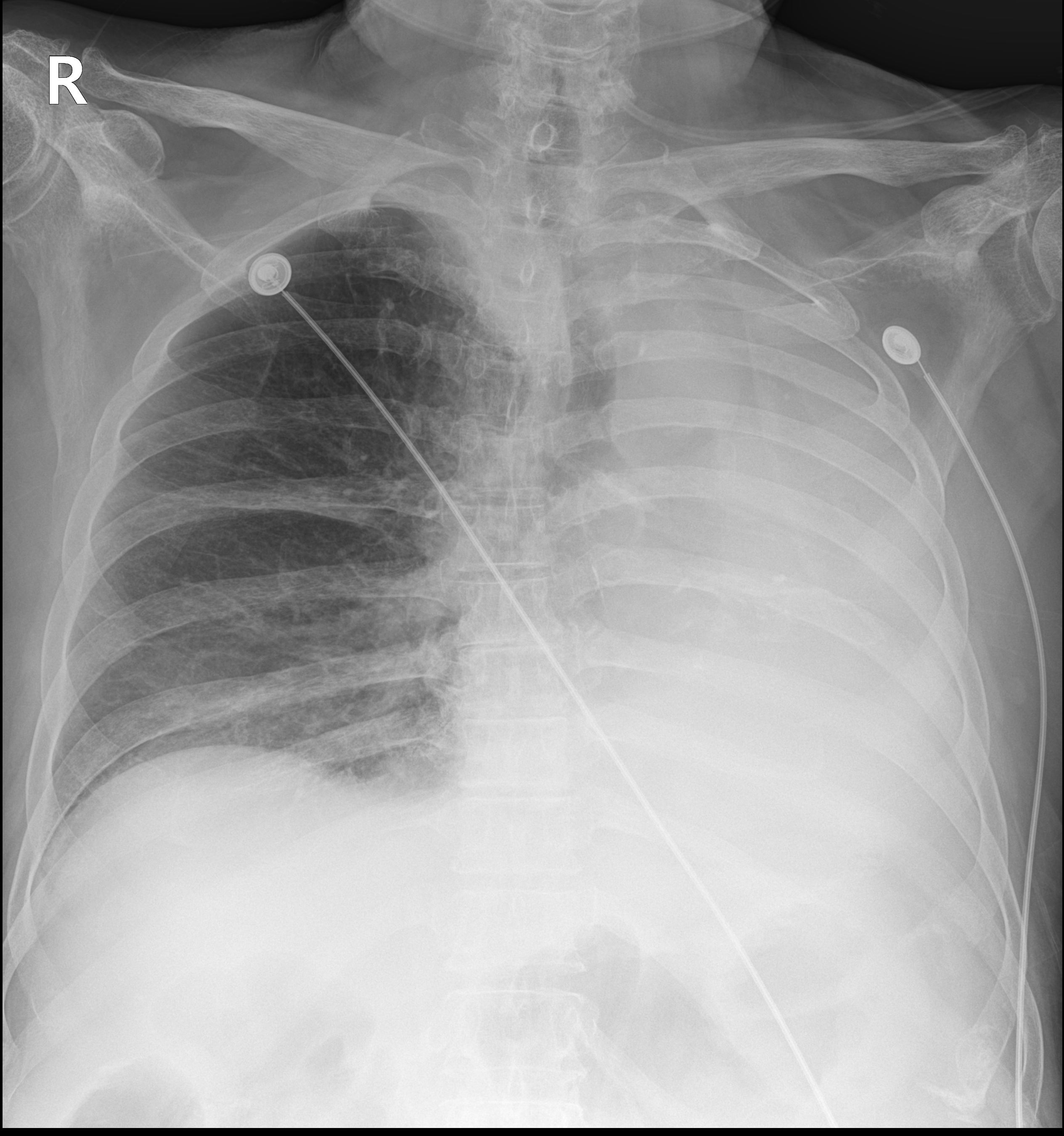 이후 촬영한 환자의 흉부 x ray 사진을 보도록 하자.