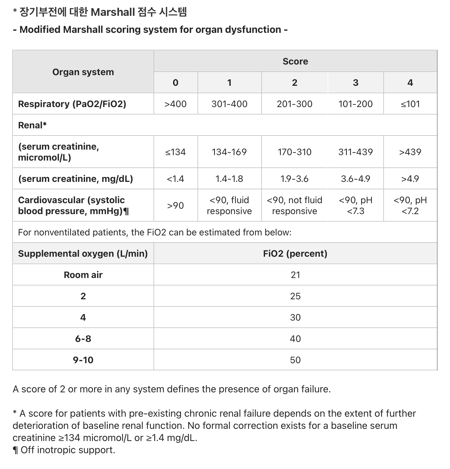 환자의 중등도를 확인하기 위해 Marshall scoring을 확인했을때에는 0점으로 장기부전까지 악화된 상태는 아니었다.