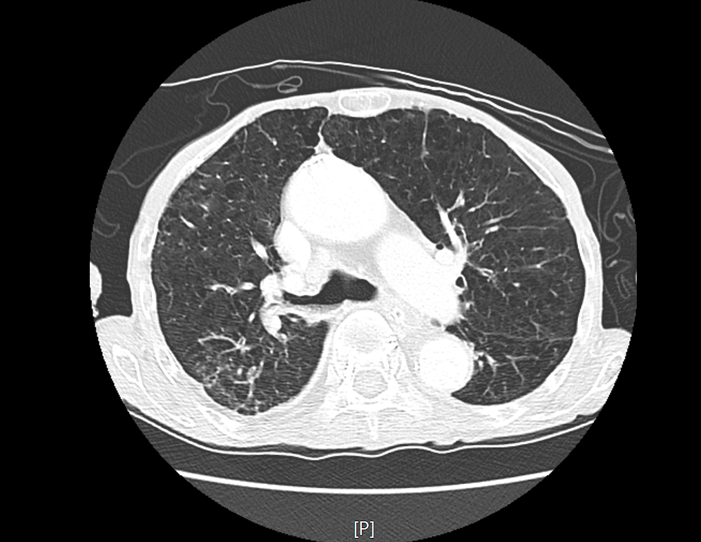 위 CT영상을 보시면, 환자의 우측 기관지부터 공기 대신 음식물이 들어가 있는 모습을 볼 수있고, 그로 인해 폐실질에는 폐렴과 무기폐가 발생되어 있는 상황이었습니다.