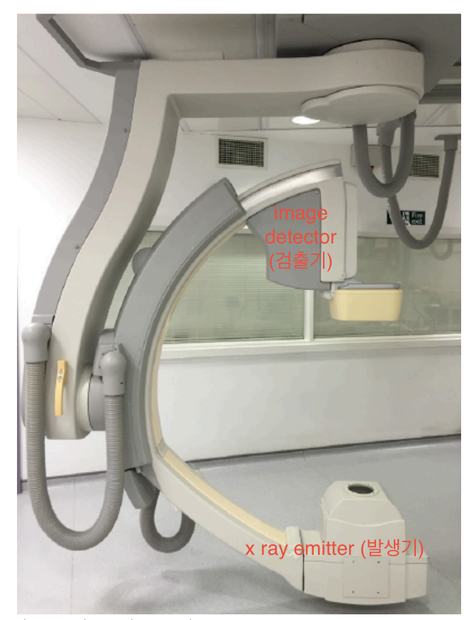 위 그림처럼 emitter와 detector는 180도 정반대에 위치하고, 알파벳 'C'모양으로 생긴 팔로 이를 고정하여 회전운동을 할 수 있도록 고정되어 있다. 이를 모양을 본떠서 C-arm이라고 부른다.