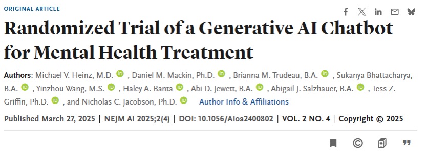 NEJM AI에 2025년 3월 27일에 "Randomized Trial of a Generative AI Chatbot for Mental Health Treatment"이라는 제목의 논문이 하나 올라왔다.