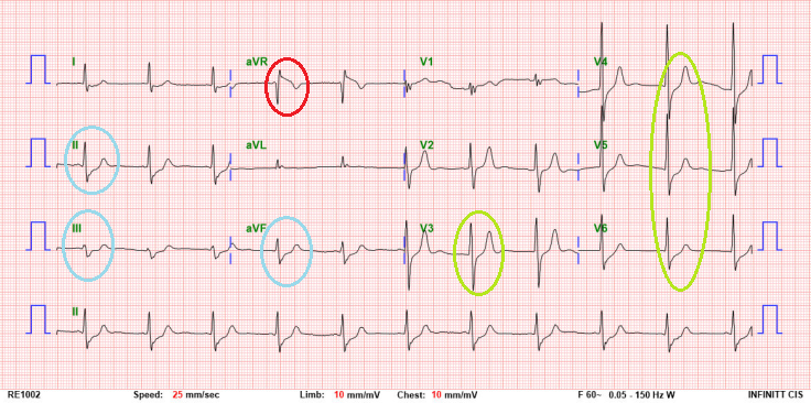 aVR에서의 ST elevation 소견과 함께 inferior lead인 II, III, aVF에서의 ST depression, 그리고 precordial lead에서 광범위하게 ST depression이 보였다.