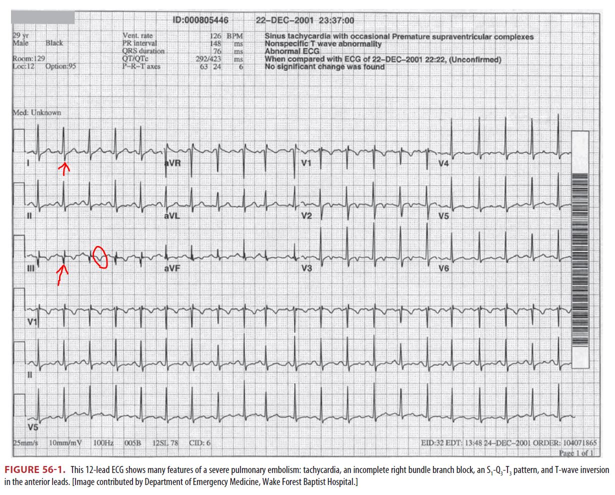일부 PE환자에서는 초기 심전도에서 특징적인 소견을 보이기도 한다. 바로 'S1Q3T3'인데, lead I의 S wave가 두드러지고, lead III에서는 q wave가 두드러짐과 동시에 T wave inversion이 확인된다. 이외에도 호흡곤란이나 흉통으로 tachycardia가 동반되어 있는 경우가 많고, incomplete/complete RBBB의 패턴이 동반되기도 한다.