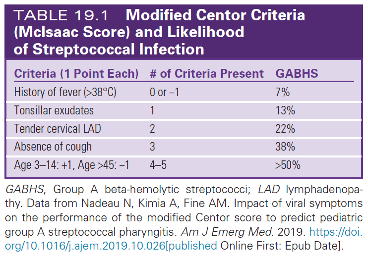 - Centor 기준: 열, 편도 고름, 림프절 부종, 기침 없음 점수화(GAS 가능성 예측).