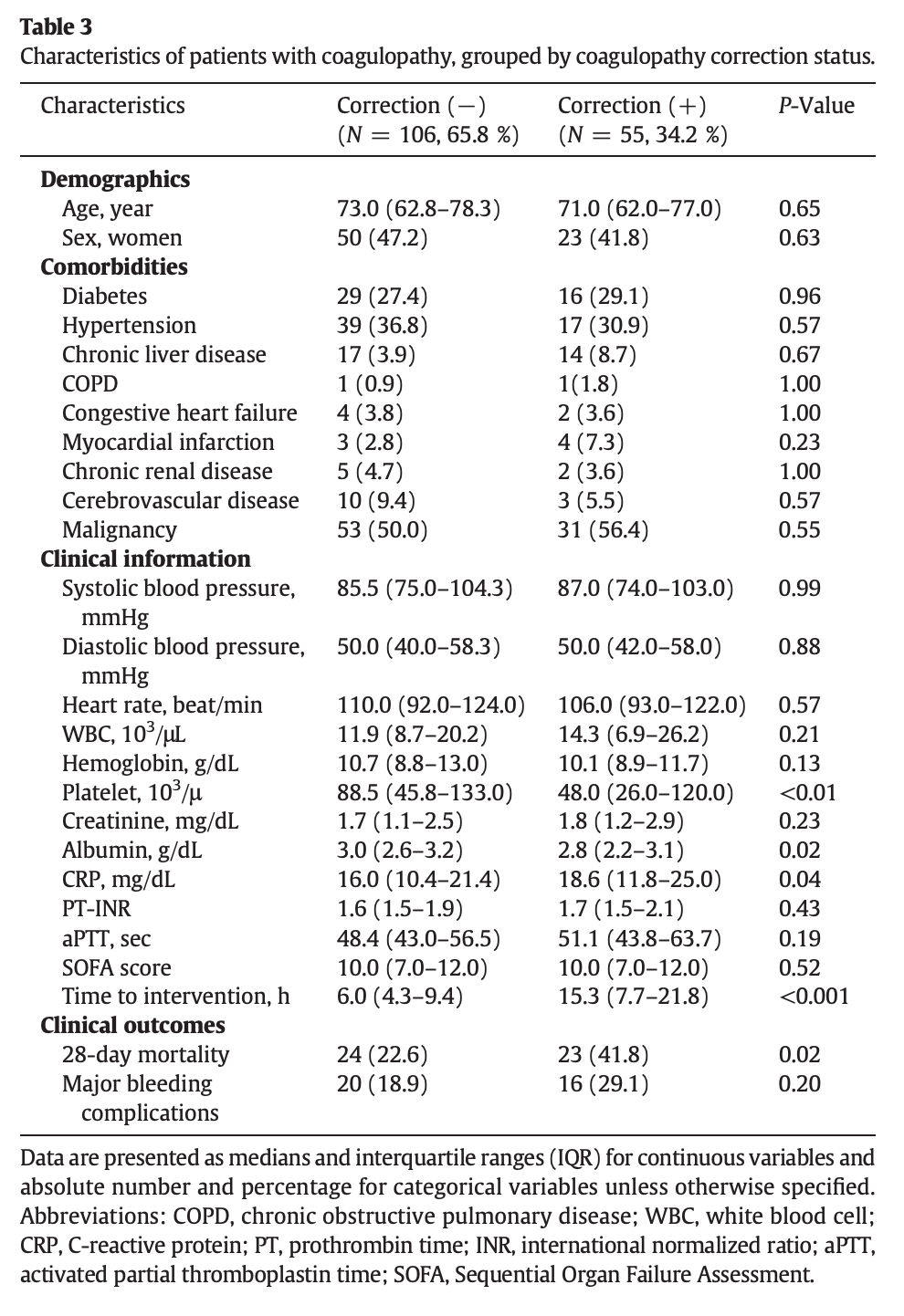 - coagulopathy 교정을 받은 환자들은 교정을 받지 않은 환자들보다 28일 사망률이 더 높았다(41.8% vs 22.6%; P = 0.02).