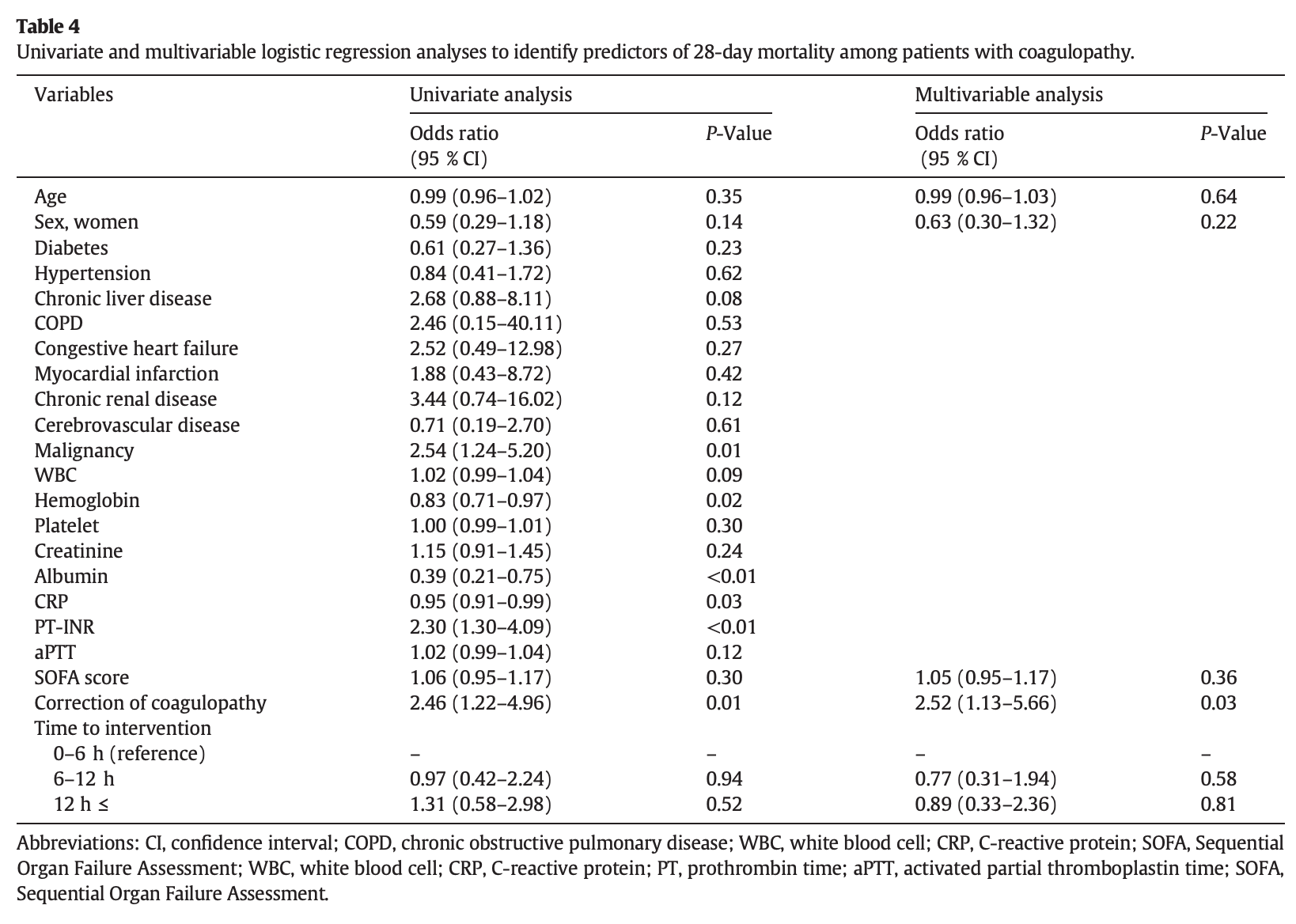 - coagulopathy 교정과 높은 28일 사망률 사이의 강한 연관성이 확인되었다(odds ratio [OR] 2.52; P = 0.03).