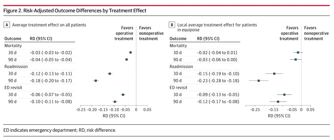 - 전체 환자 중 수술적 치료는 30일 사망률(RD, −0.03; P < .001)과 90일 사망률(RD, −0.04; P < .001)이 더 낮았다.