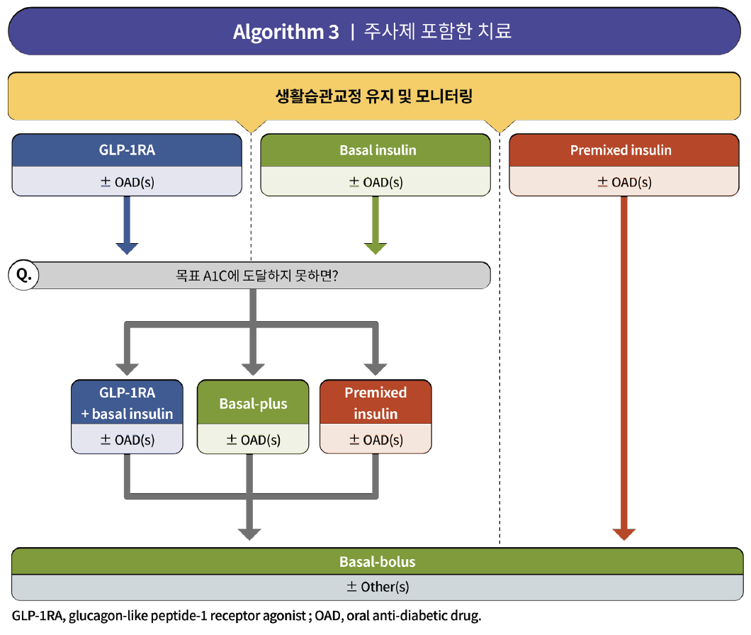 2. 목표 당화혈색소에 도달하지 못한 경우 기존의 약물의 증량 또는 다른 계열의 약물과의 병용요법(2제 이상)을 조속시 시행한다. 단, DPP-4 억제제와 GLP-1 수용체 작용제는 병용하지 않는다.