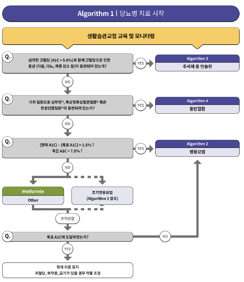 1. 약물치료를 시작할 때 목표와 현재 당화혈색소를 고려하여 단독 또는 병용요법을 고려하지만, 혈당조절 실패의 위험을 낮추기 위해 초기부터 병용요법을 적극적으로 고려한다.