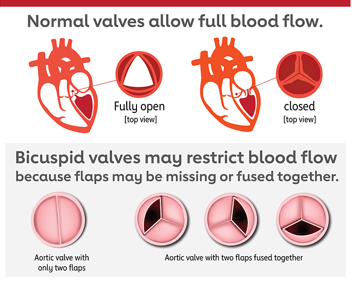 본래 3개여야 할 대동맥 판막이 두 개밖에 없는 경우(bicuspid aortic valve), 3개의 판막 중 2개가 붙어버리는 경우(fused flap), 심장이 자라면서 판막도 커져야 하는데, 판막이 커지지 못하는 경우가 있다.