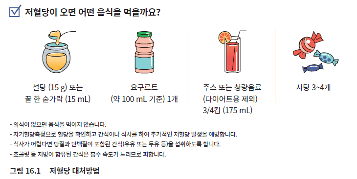 특별한 후유증 없이 포도당 수액의 주입으로 저혈당 증상이 사라지고, 의식도 온전히 회복되었다면 특별히 입원을 필요로 하지는 않는다. 하지만 집에서도 혈당을 자주 확인하고, 식사를 잘 챙겨먹고, 평소 먹는 당뇨약과 인슐린을 적절히 조절할 수 있는 능력이 요구된다.